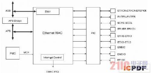 图3MAC控制器框图2。3100M以太网AT91RM9200集成有以太网控制器EMAC(EthernetMAC)使这款芯片具有了更为广泛的应用价值。从硬件的角度看,以太网接口电路主要由MAC控制器和物理层接口两大部分构成。该设计中,使用LXT972作为以太网的物理层接口。LXT972是一款低功耗、高性能芯片,支持lOM和100M的以太网传输,它起编码、译码输入和输出数据的作用。由于LXT972和AT91RM9200具有的EMAC都支持MII接口功能,根据信号的定义相连接即可。信号的发送和接收端通过网络隔离变压器和RJ45接口接入传输媒体,Emac框图如图4。