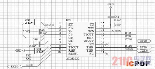 图1SDRAM存储器电路2。2RS232串行通信口目前RS-232是PC机与通信土业中应用最广泛的一种串行接口。RS-232被定义为一种在低速率串行通讯中增加通讯距离的单端标准。RS-232采取小平衡传输方式,即所谓单端通讯。AT91RM9200输出的串行信号是TTL电平,必须经过电平转换输出符合EIA/TIA-232电平,电路设计见图3。