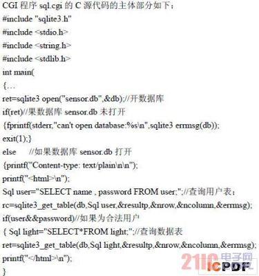 由于CGI程序是用C语言编写的,经过编译生成可执行的二进制代码,所以它具有占用空间小,运行速度快,安全可靠等优点。该sql。cgi程序启动后首先查询用户表完成用户名和密码的鉴定,如果是合法用户则根据用户的查询条件查询数据库中的温度或光感强度数据表将查询结果显示在主页上,若为非法用户则给出登陆错误提示信息返回到主页。