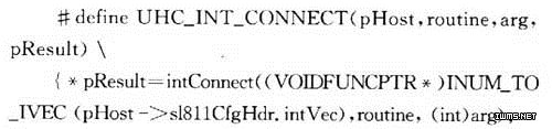 调用UHC_INT_CONNECT(pHost,intHandler,pHost,&s)函数连接SL811主控制器芯片中断。UHC_INT_CONNECT是一个宏定义。