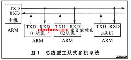 所谓主从式多机系统,即在数个arm(或单片机)中,有一个是主机,其余的为从机。从机要服从主机的调度、支配,其拓扑结构如图1所示。