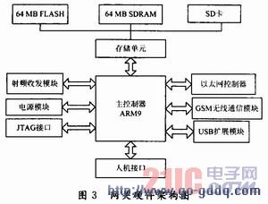 考虑主控制器扩展出来的串行接口数量有线,程序的调试,烧写,传感器节点等都需要串行接口。所以,选择了AU9254这款USB PUB芯片来实现USB串行口的扩展。以太网控制器和配合扩展的RJ 45接口主要用于与Internet网络互联。射频收发模块和GSM无线模块拟采用标准的串口集成到网关上。人机接口打算使用LCD触摸屏,可以方便地观察节点的配置以及检测环境的变化。JTAG接口将引导加载程序烧写在网关中。具体的硬件架构图如图3所示。
