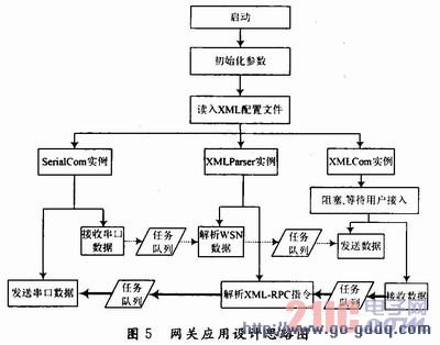 程序设计思路如图5所示:网关程序启动,完成参数初始化,解析XML文件夹下的所有传感器配置文件,创建3个类的实例。4个任务队列。Serialcomm类创建两条线程用读串口和写串口,这样可以保证数据的实时性。基于同样的道理,XMLParser类和XMLComm类也是双线程并行工作。这样就组成了从WSN和Internet的上行通道(图5中的虚线表示),以及Internet到WSN的下行通道(图5中的粗线表示)。