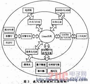 上位PC通过RJ-45接口电路接入ARM的UART1口,双频读写器、刷卡器、数字键盘和指纹仪接入RJ-45接口电路,再分别接入ARM的UART2-5口,摄像头通过USB口连接ARM的USB主机端口。ARM输出的电控锁和报警器控制信号,经过ULN2003A运放芯片控制直流小继电器,驱动电控锁和报警器工作。振动传感器通过74L804反相输出到ARM的输入I/O管脚。NANDFLASH直接与ARM的I/O管脚连接。