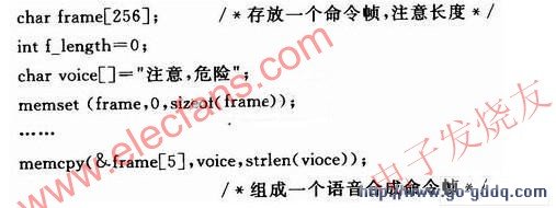 当所测距离值小于阈值时,由S3C2440发控制命令给XF-S3011,启动语音模块。组成一个语音合成命令帧的部分代码如下: