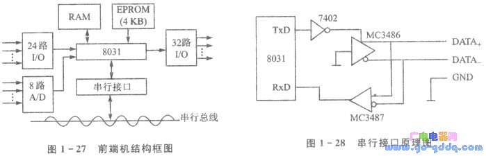 图1- 27是前端机的结构框图。它是一个带RS - 422串行接口的51系列单片机系统。其输入/输出和A/D转换的通道数是根据实际应用控制系统(如汽车自动检测线)的需要而配置的,与通信无关。图1- 28给出了串行接口原理图。每个前端机和通信控制器的接口均用MC3486和MC3487作差分驱动和接收。串行总线由一对双绞线DATA+和DATA-组成。双绞线的末端有提升电阻,使线路在空闲时处于逻辑1状态。当发送逻辑o(TxD=O)时,线路处于0状态。这种差分驱动和接收总线在电气特性上符合RS - 422标准,比起RS - 232,这样的单端驱动总线具有抗干扰能力强,数据传输率高,距离远等优点。