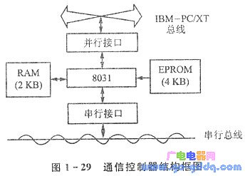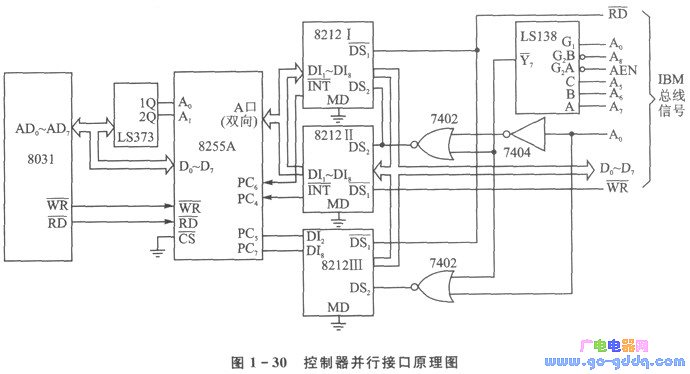 控制器的结构框图如图1- 29所示,8031通过串行接口和并行接口分别和各前端机以及主机交换数据。并行接口的原理图见图1- 30,控制器和IBM - PC/XT间的数据交换是以查询的方式实现的。8255A工作于A口方式2(双向总线I/O),控制器向IBM - PC/XT输出数据时,首先WR信号有效将数据写到A口,这使得PC7( OBFA)一O(初始状态OBFA =1);IBM - PC/XT通过读8212Ⅲ的状态得知OBFA=O后,再读8212 I即可将A口数据读入;与此同时,8212 I的INT信号使OBFA恢复到初始状态。IBM - PC/XT向控制器送数据时,用输出命令将数据写入8212Ⅱ;同时8212Ⅱ的INT信号有效,使PC4( STBA)产生一个选通信号;该信号将PC5(IBFA)置为有效(即IBFA =1,初始状态IBFA=0),8031读8255A的C口状态得知IBFA =1.再读A口即可将数据读入控制器。并行口地址采用部分译码,8212 I和8212Ⅱ的地址是02EOH;8212Ⅲ的地址是02EIH。