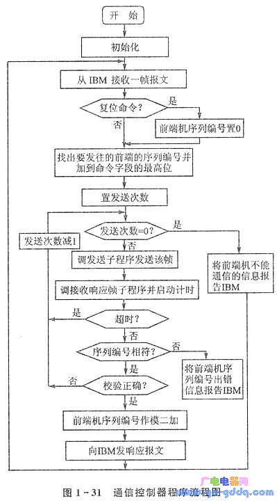 通信控制器的程序流程图如图1- 31所示。其中初始化包括:①设定不高于100 kb的波特率;②设定超时计算用的To中断为最高级中断;③设定SP堆栈寄存器的值为30H;④初始化8255A使A口工作于方式2。从IBM接收一帧报文,将前端机不能通信的信息报告IBM.将前端机序列编号出错信息报告IBM及向IBM发响应报文,均是以查询方式与IBM - PC/XT交换数据的程序模块;发送子程序和接收响应帧子程序为满足通信协议的通信程序模块。限于篇幅,不再详述。程序的长度约2.4 KB。
