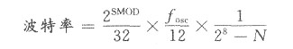 式中:SMOD=1或0,由软件设定;N为软件设置的定时器自装载常数,其值为0~255。当SMOD-1.N-255时,波特率最高,为fosc/192;当SMOD=0,N=O时,波特率最低,为: