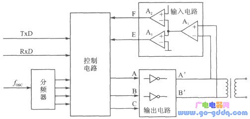 收/发电路的组成框图如图1 - 17所示。该装置由控制电路、分频器、输出驱动、差动输入、耦合变压器等组成。控制电路由一片GAL电路或由门电路组成,输出驱动采用三态门,差动输入利用三片运放组成两级比较电路,分频器提供控制电路工作的基准和状态变化的条件,耦合变压器用来实现信号的输入或输出。