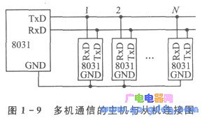按一般介绍,多机通信的主机与从机连接如图1-9所示,通过软件编程实现由主机查询、从机响应的通信方式,但这种通信方式只限于主机与从机近距离(几米)范围内。这是因为串行口TxD发出的TTL电平信号无论在驱动能力还是在抗干扰能力方面都不足以实现远距离串行数据传送,所以要实现单片机串行口的远距离通信(几十米到几千米),必须另辟蹊径。