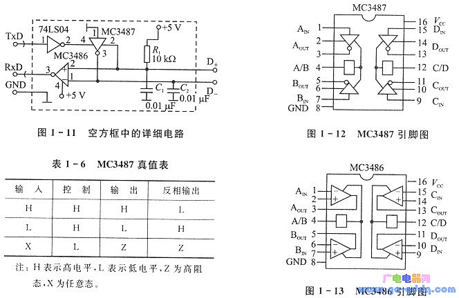 MC3487的引脚如图1- 12所示,真值表如表1-6所列。它是一个有三态输出的四RS -422 A传输线驱动器,脚1是第一个驱动器的输入端;脚2、脚3是第一个驱动器的同相、反相输出,输出受脚4控制。当脚4为低电平时,输出脚2、脚3呈高阻态。MC3486的引脚如它是一个有三态输出的四差分线路接收器,脚l、脚2为第一个差分接收器的反相、同相输入端;脚3为输出端,输出受脚4电平控制。当脚4接高电平时,允许输出。