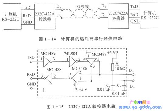 有时多机通信系统中一端是计算机或两端都是计算机,如图1 - 14所示。通常计算机本身都带有RS - 232C串行通信口。RS - 232C串行口是电子工业协会(EIA)的一种标准串行数据通信口,在电气性能上采用负逻辑定义。逻辑1电平为-5~-15 V,逻辑O电平为+5~+15 V。但RS一232C的通信距离也不允许太远,一般要求在15 m内。为延长计算机通信距离,可像前面介绍的方法一样,在RS - 232C前加入一个232C/422A转换器,把232C电平传输变成差分驱动、接收。232C/422A转换器的电路如图1-15所示。由图可见,电路只是比前面详细介绍过的图1- 11电路多加一片MC1489和一片MC1488。MC1489是RS - 232C串行通信接收器,图1-15中它把计算机串行TxD发出的232C电平转换成TTL电平,供MC3487驱动传输;MC1488是RS - 232C串行通信发送器,图1-15中它把MC3486接收的电平转换成232C电平,送到计算机串行接收端RxD。这样接入232C/422A转换器后,计算机间变成差分线路传输,只需D+和DL两根双绞线,达到延长通信距离,消除共地地电势影响的目的。