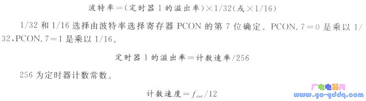 波特率的设定 单片机定时器作为波特率发生器。为此定时器1须是工作方式2,即自动重装载模式。TL1作为8位计数器,TH1作为常数缓冲器。当TL1计数溢出时,将TH1中常数送到TLO中,使TL1再次从初值开始重新计数。定时器1产生固定频率占空比是1:1的脉冲,波特率可由设定时间常数确定。