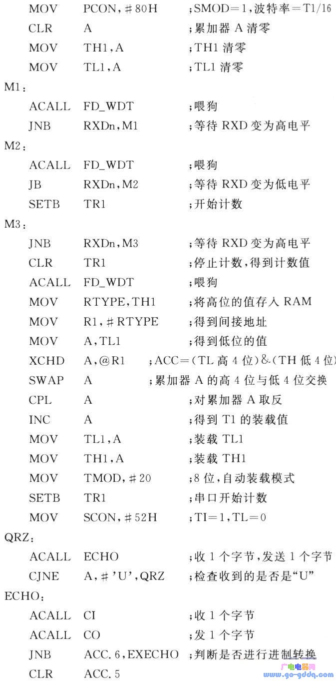 上位机按照自身的波特率,向下位机发送一个大写的英文字符“U”,ASClI码为55H,二进制为“01010101B”,也就是一组“O”,“1”相间的数据。下位机收到数据,计算出1位数据的传输时间(2个“1”之间的时间间隔),则所对应的通信波特率就可以计算出来,下面是汇编语言程序:
