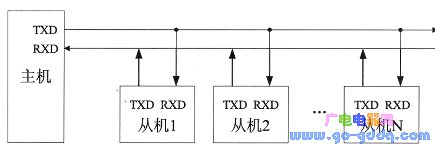由图可知,主机的RXD、TXD与所有从机的TXD、RXD端相连接,主机发送的信号可被各从机接收,而各从机发送的信息则只能由主机接收。