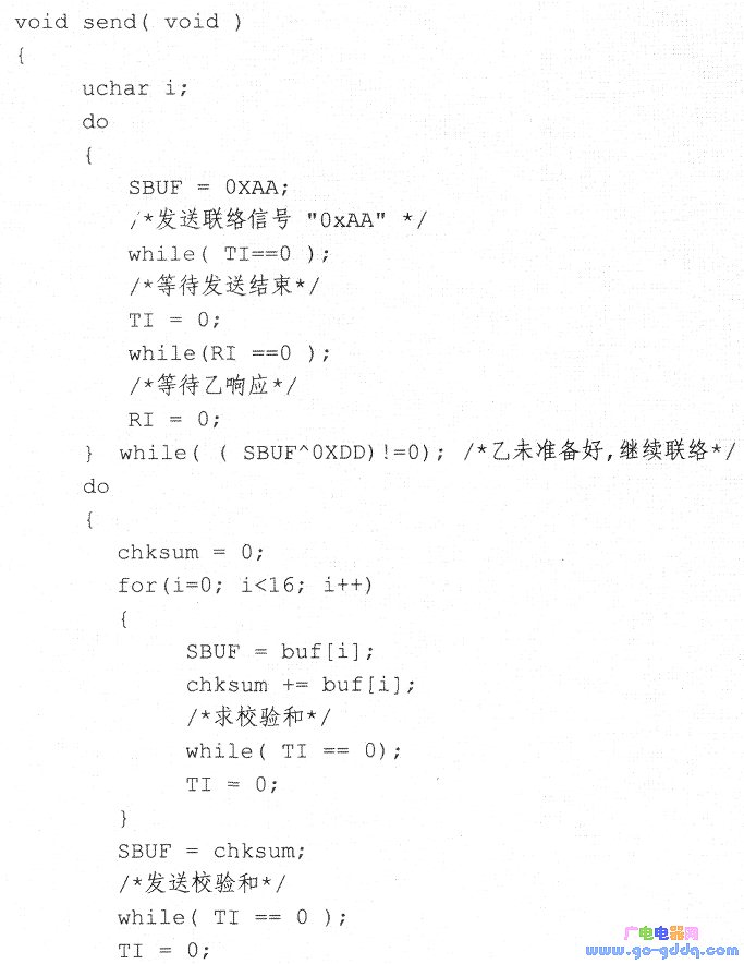 甲机发送子程序send()完成甲机发送数据功能。首先发送联络信号,然后等待乙机响应。