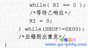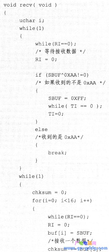 乙机接收程序根据制定的联络信号接收数据。接收到数据后,如果收到的数据不是0×AA,则发送0×FF数据表明未收到联络信号并继续等待。收到联络信号后,接收数据并计算校验和,若校验正确则发送0×00表明数据正确,否则发送0×FF说明数据接收错误。程序代码如下: