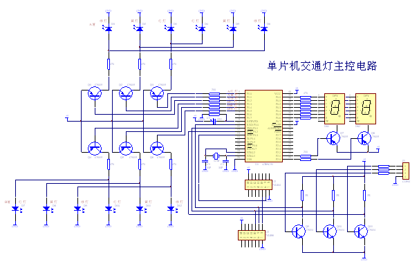 用数码管模拟交通灯上的数字显示板。数码管的七段由AT89C51的P0(P0.0-P0.6)口控制,两个数码管由P2(P2.0-P2.1)口选通,中间由PNP三极管作为推动管。