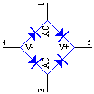 电桥1、3端接交流电源,2、4为支直流输出端。当某一时刻,交瞬时值为上+下-(即1端为+,3端为-),电流从1端输入,经1、2间的二极管到2端,再经2、4端的负载流到4端,然后经3、4间的二极管流回交流负端;同理,电流从3端流入,从1端流回交流负端。