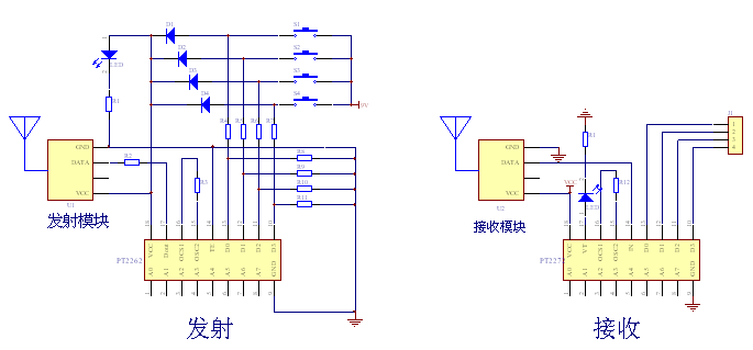 编码芯片PT2262发出的编码信号由:地址码、数据码、同步码组成一个完整的码字,解码芯片PT2272接收到信号后,其地址码经过两次比较核对后,VT脚才输出高电平,与此同时相应的数据脚也输出高电平,如果发送端一直按住按键,编码芯片也会连续发射。当发射机没有按键按下时,PT2262不接通电源,其17脚为低电平,所以315MHz的高频发射电路不工作,当有按键按下时,PT2262得电工作,其第17脚输出经调制的串行数据信号,当17脚为高电平期间315MHz的高频发射电路起振并发射等幅高频信号,当17脚为低平期间315MHz的高频发射电路停止振荡,所以高频发射电路完全收控于PT2262的17脚输出的数字信号,从而对高频电路完成幅度键控(ASK调制)相当于调制度为100%的调幅。