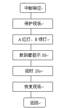 紧急车辆出现是的中断服务程序也需要保护现场,但无需关中断(因其为高优先级中断),然后执行相应的服务,待交通灯信号出现后延时20S,确保紧急车辆通过交叉路口。然后,恢复现场,返回主程序。