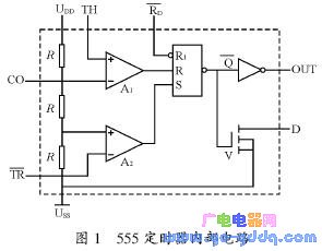 CO端是控制电压输入端,加控制电压可改变A1“-”端及A2“ +”端的参考电压,若不用,可通过一个小电容接地,以防旁路高频交流干扰;R 为定时器直接复位端,加低电平可将定时器直接置“0”,此时,OUT输出“0”,Q 为1”,V 导通,D 端对地通路;TH 为复位阀值输入端,当TH 电压超过2/3UDD(即A1 负端分压)时,A1 输出为“1”,OUT 输出“0”,同样,D 端对地通路;TR 为置位输入端,当TR电压低于1/3 UDD(即A2 正端分压)时,A2 输出“1”,定时器被置位,此时,OUT 输出“1”,Q 为“0”,V截止,D端对地断路。