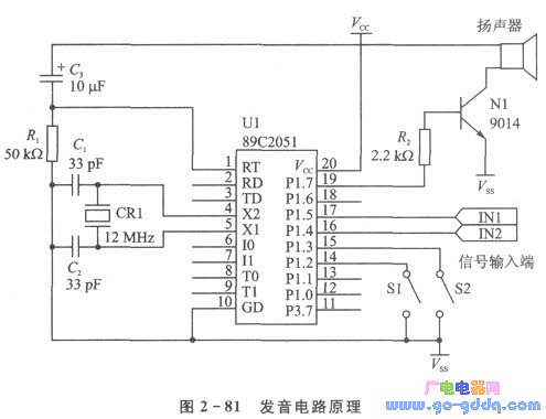 本节介绍使用AT89C2051制作的一种发音电路,各种声音通过编程实现,灵活方便。其原理图如图2 - 81所示。