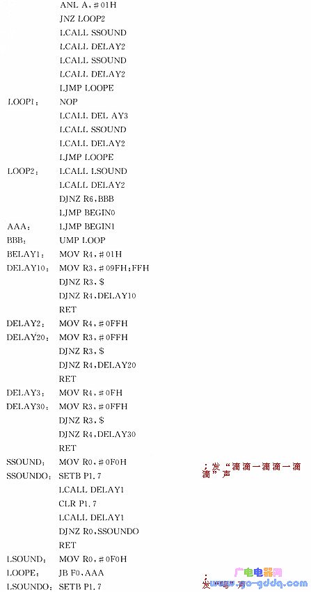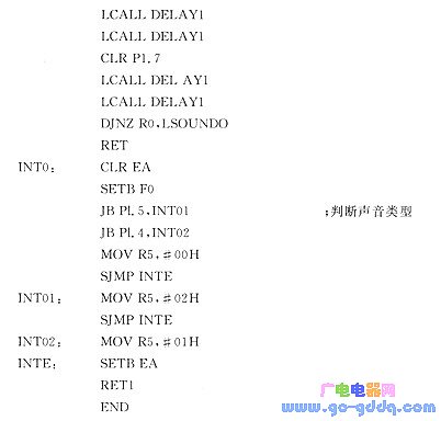 该电路利用方波谐波成份丰富的特点,编程采用计时器延迟法发音,即每个音的半周期计时中断一次,而使输出Pl.0(或其他I/O口)反相,重复执行产生某种频率的信号。例如:中音DO的频率为523 Hz,其周期为1 912 μs,若初始Pl. 0=1,经956 μS后,应使Pl.0=0,再经956 μs恢复Pl.0-1,这样就可发出中音DO。