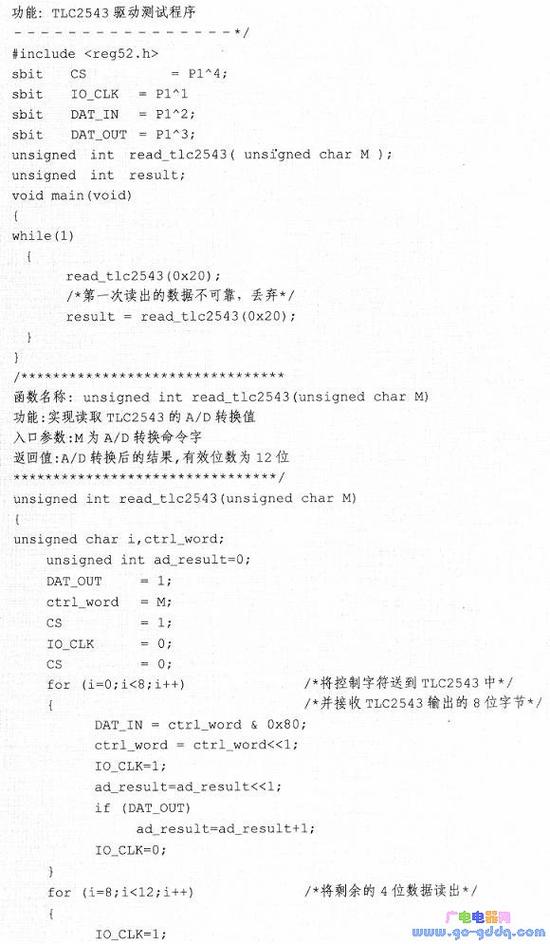 TLC2543通过串行接口与单片机通信,接口程序按照TLC2543的工作时序要求编写,根据图9-2中硬件连接关系,编写单片机89C51采样外部AINO通道模拟量的程序。主要包括用于实现读取TLC2543的A/D转换值子程序,具体C51程序如下。