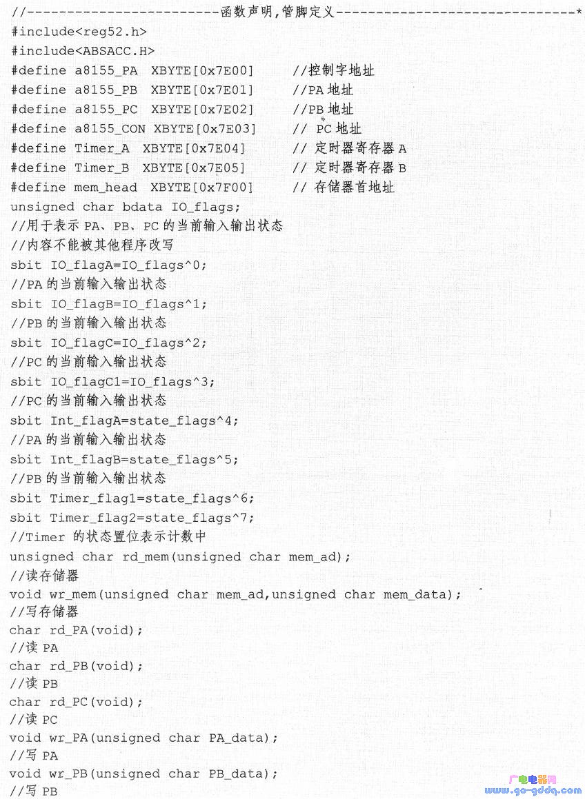 管脚定义主要是指端口PA、端口PB、端口PC、控制字以及定时器A、B和存储器首地址和相关标志位的定义;函数的声明涉及存储器及端口PA、端口PB、端口PC的读写函数、中断的开关函数和定时器相关函数,具体代码如下: