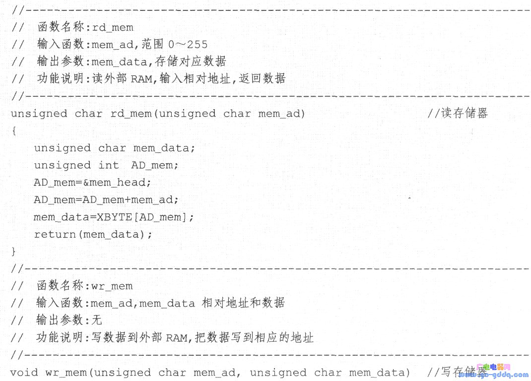 读写外RAM函数对外部存储器指定单元数据进行读写,程序代码如下: