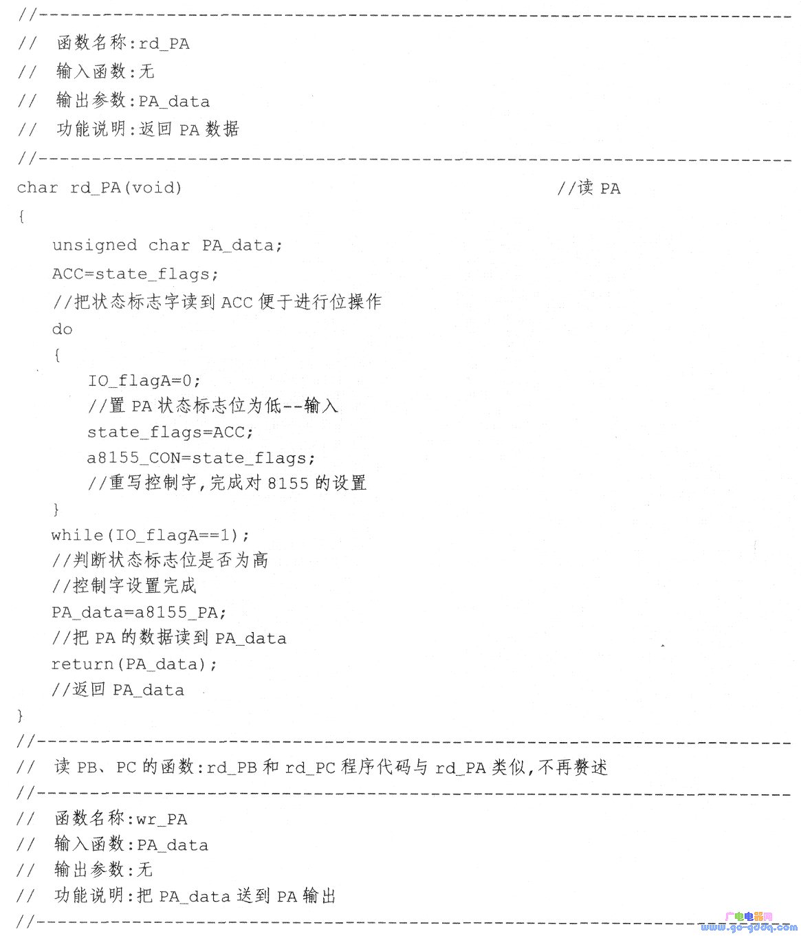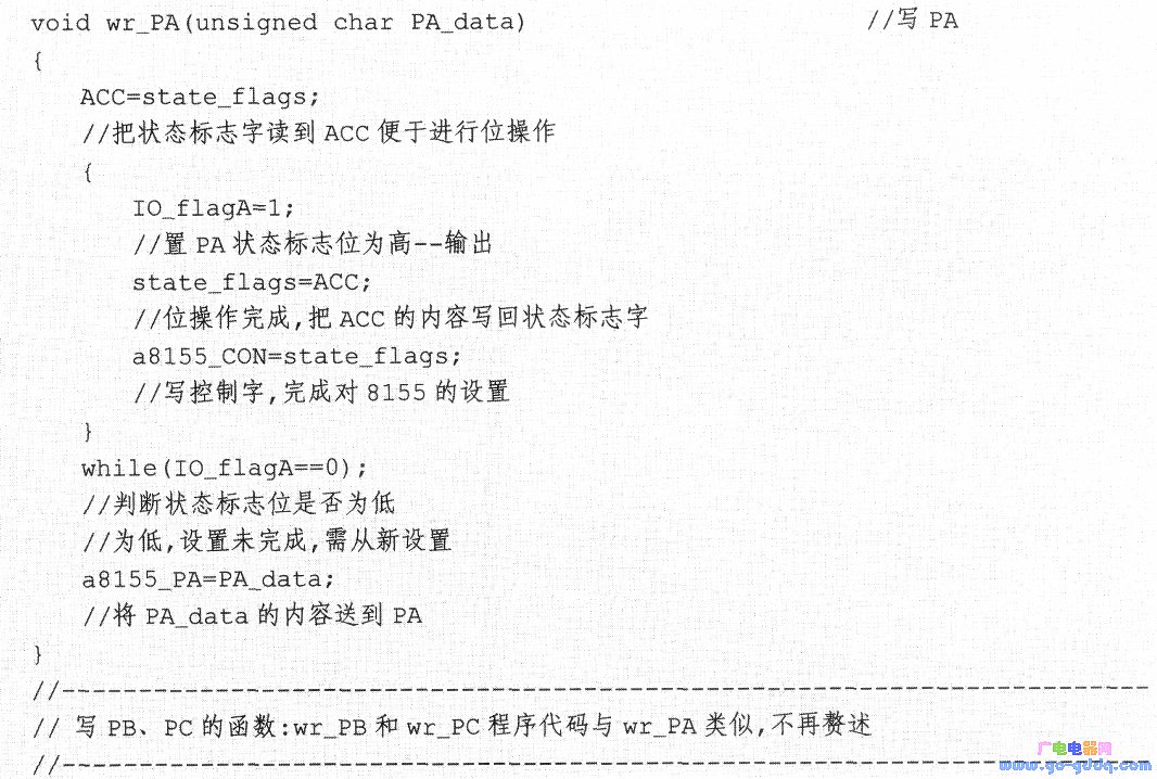 端口PA、端口PB以及端口PC的读写设置函数主要完成对8155端口的输入输出设置及数据读写,程序代码如下:
