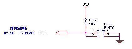 有输出总会有输入,今天测试一下按键的功能,第一节已经说过了与GPIO端口相关的寄存器,这里不在重复,想要从端口读取数据,首先把FIODIR这个寄存器设置为输入,再从FIOPIN寄存器读取数据就可以了,这个寄存器具有读写功能。下面说一下这个实验的电路图,如下所示:
