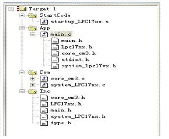 上一节对程序没有做过多的解释,这里详细分析一下,工程中包含的源文件如下图所示: