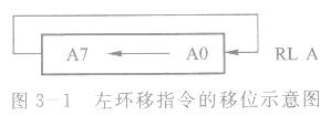这条指令的功能是累加器A的8位向左循环移位,位7循环移入位O,不影响标志位,如图3-1所示。
