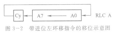这条指令的功能是将累加器A的内容和进位标志位Cy一起向左环移一位,ACC.7移人进位位Cy,Cy移入Acc.0,不影响其他标志位,如图3-2所示。