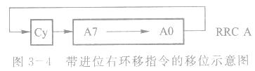 这条指令的功能是累加器A的内容和进位标志Cy 一起向右环移一位,Acc.O进入Cy,Cy移入Acc.7,如图3-4所示。