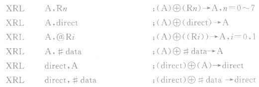 这组指令的功能是在所指定的变量之间执行以位为基础的逻辑异或操作,结果存到目的变量寄存器或存储器中。操作数有寄存器寻址、直接寻址、寄存器间接寻址和立即数寻址方式。