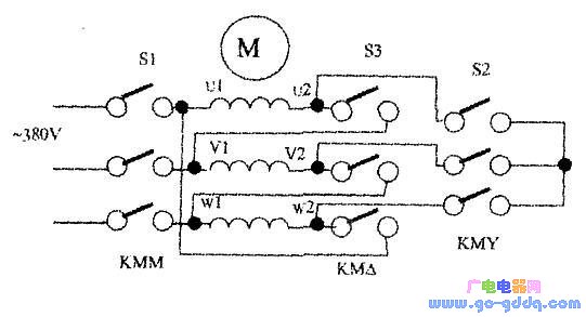 电路如上图、下图所示。KMM和下图中的KMY、KM△(下图中未画出)与KMM的接法相同,KMM及KMY、KM△为大功率继电器。