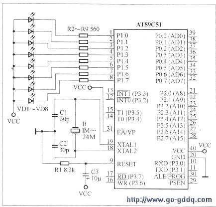 当前开发单片机应用系统程序主要应用汇编语言和C51语言,采用汇编语言编写可直接操纵系统的硬件资源,能编写出高效运行的程序代码,程序运行速度快。而采用C51语言编写可改善程序的可读性和可移植性,利于产品的更新换代,大大加快了单片机应用程序的开发速度。下面通过一个简单的实验--跑马灯实验来分析一下这两种语言的差别。用AT89C5l实现的跑马灯实验的原理图如xia 图所示。