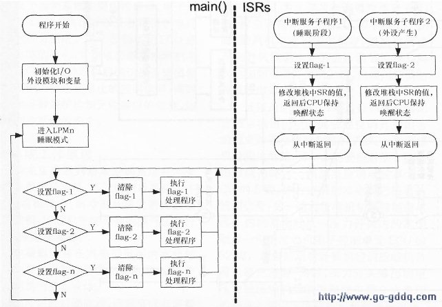由于可以在fSR中断服务子程序中改变低功耗模式,所以设计者可以选择在ISR程序中执行全部任务,也可以选择在ISR唤醒MCU后在主程序中处理任务。