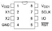 DS1302 的引脚图如图1 所示, 其中VCC2 为主电源,Vcc1 为后备电源。在主电源关闭的情况下,也能保持时钟的连续运行。X1、X2 是振荡源,外接32.768kHz晶振。RST 是复位/ 片选线,通过把RST输入驱动置高电平来启动所有的数据传送。当RST 为高电平时,所有的数据传送被初始化,允许对DS1302 进行操作。如果在传送过程中RST 置为低电平,则会终止此次数据传送,I/O 引脚变为高阻态。上电运行时,在Vcc > 2.0V 之前,RST 必须保持低电平。只有在SCLK 为低电平时,才能将RST 置为高电平。I/O 为串行数据输入输出端( 双向) ;SCLK 为时钟输入端。