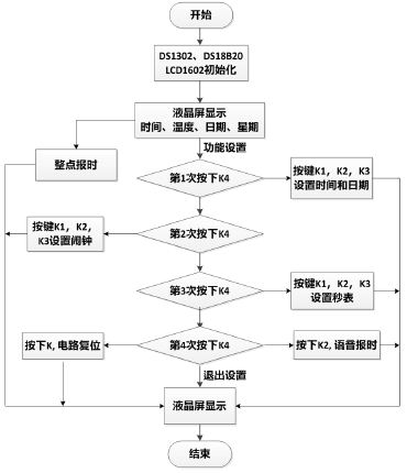 该万年历的程序流程图如图3 所示,具体流程如下:首先,接通电源,上电工作,DS1302、DS18B20、LCD1602 进行初始化,通过单片机控制液晶屏显示“时分秒”、“温度”、“年月日”、“星期”,并伴随整点报时的功能;然后,进入功能设置,第一次按下按键K4 可以调整“时分秒”和“年月日”,此时K1、K2 和K3 分别对应时间和日期“加”、“减”和“移位选择”的功能,日期发生变化相应的“星期”也会跟着变化;第二次按下按键K4 可以设置闹钟的功能,此时K1、K2 和K3 分别对应时间和日期“关闭”、“开启”和“移位选择”的功能;第三次按下按键K4 可以设置秒表的功能,此时K1、K2 和K3 分别对应时间和日期“复位”、“暂停”和“计时”的功能;第四次按下按键K4 可以退出设置功能,因为该万年历加入了语音芯片,此时按下K2 键具有语音报时的功能。