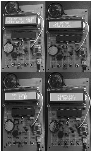待该可测温式电子万年历焊接和软件编程完成后,进入调试环节,将keil4 中C 语言程序生成的hex 文件烧入到STC89C52 芯片中,连接电源后将万年历放入模拟环境中进行系统调试,调试结果如图4 所示。液晶显示屏显示“时间”、“温度”、“日期”和“星期”信息,同时可以整点报时,如图4 中A 图所示。
