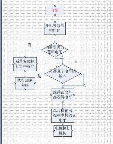 该流程图设计是按照,项目所需的功能实现的,其中有逻辑电平的判断以及电机执行机构的电平输出。全面考虑了系统可能出现的疏漏。在防破解方面也作出了许多方面的算法考虑。