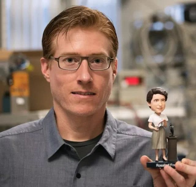 英特尔神经拟态计算项目主管Mike Davies手持科学家罗莎林·富兰克林造型的摇头娃娃,英特尔的自主学习神经拟态芯片Loihi能够快速地学会识别它。(照片来源:Tim Herman/英特尔公司)