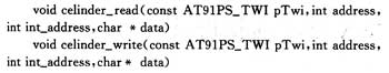 其中,pTwi是结构体指针,指向的结构体中存放TWI的寄存器,通过pTwi即可访问各TWI寄存器;address表示设备地址;im_address表示设备内部地址;data代表读写数据的变量指针。