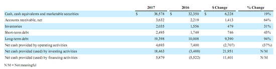 上表可看出,发债融资金额占比较高。其中反应企业核心盈利能力的运营现金流仅47亿美金,比2016年降低了近37%。主要由于黑莓诉讼费用和KFTC的罚款支出总共约18亿美金,以及未收到苹果的权利金费用。