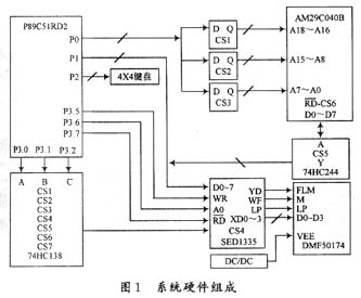 在本实例中,从低成本、低功耗设计理念出发,以Philips公司的P89C51RD2单片机为核心,输入用4×4的复用键盘,既可输入数字,也可输入字母或拼音,汉字库保存在AMD公司的A M29C040(512 k×8 b)FLASH上,液晶显示模块DMF50174(320×240),显示控制器SE D1335是日本SEIKO EPSON公司出品的液晶显示控制芯片。各个芯片的片选(控制信号)由74 HC138译码产生。